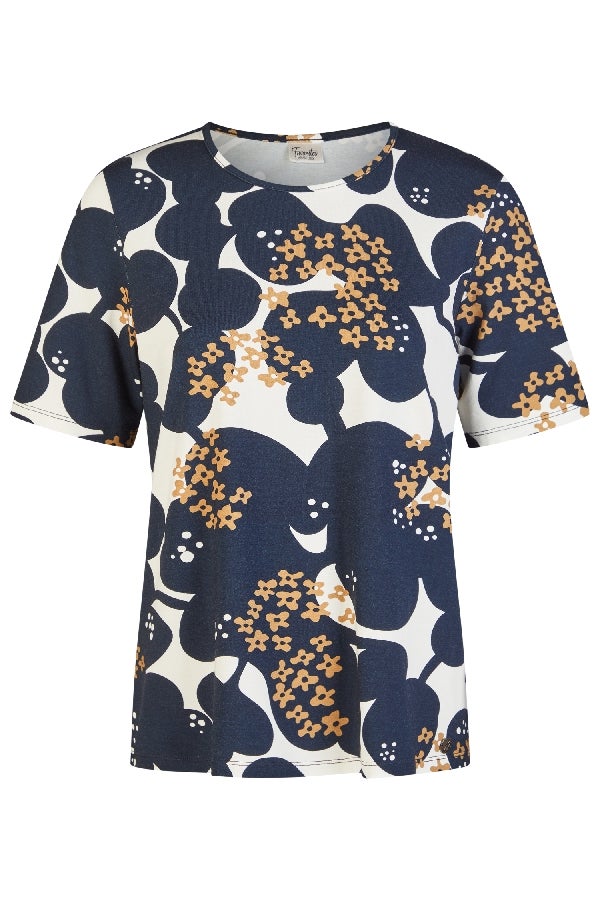 Kiva, kuosillinen t-paita joustavaa ja miellyttävää viskoositrikoota. Kauniisti laskeutuvassa puserossa on pieni, pyöreä pääntie ja 1/2-pituiset  hihat. Helman pituus koossa 40 on n. 61cm.
